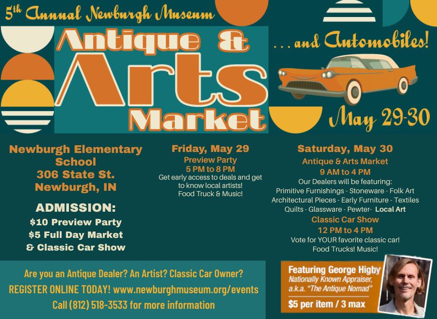 $5 Ticket Includes: Admission to 20+ antique and art booths from the Midwest region from 9am to 4pm at the Newburgh Elementary School (306 State St.) AND a Classic Car Show! We are excited to welcome back George Higby, “The Antique Nomad”! Curious if that old painting is worth anything? Antique jewelry? Textiles? This is YOUR opportunity to find out for just $5 per item with a 3-item max!