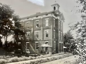 The Newburgh Graded School was built in 1868 for $14,000 and housed elementary through high school grades. It was located on the western end of where Newburgh Elementary is located today. Notice that the photograph shows a dirt road. The bell from the former Delaney Academy (see sign #13) was passed down to the Graded School. In 1924, a separate Newburgh High School building was built just north of the Graded School. It closed in 1959. The Grade School was demolished in 1958 and the High School in 1969. A new Newburgh Elementary School was built on this site in the early 1970s. The historic school bell now is housed above the foyer of the current school on the State Street end of the building.