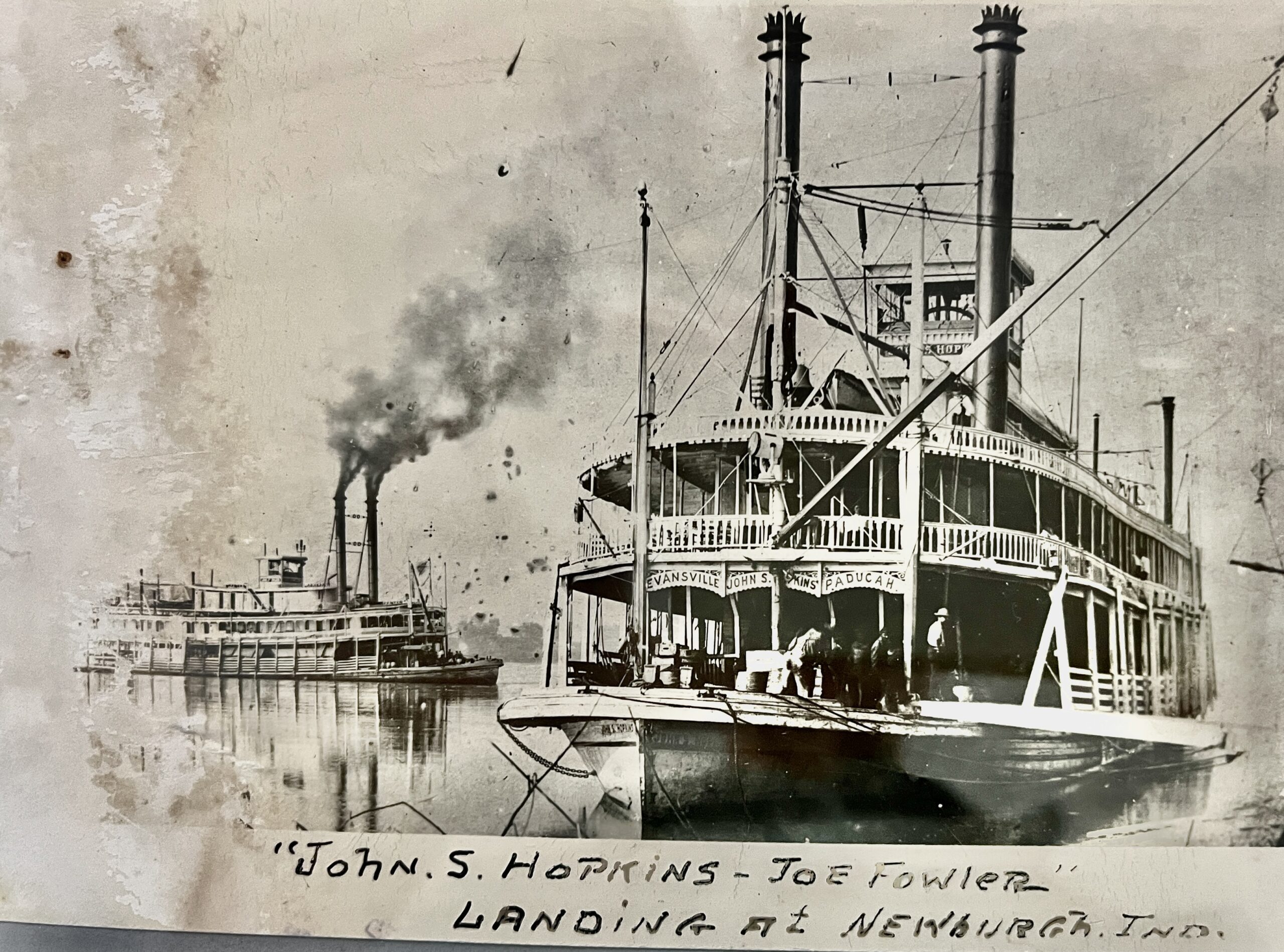 The John S Hopkins (on the right) was built in 1880, and later in her career was converted to an excursion boat cruising between Henderson and Evansville and boasting of a 3000 square foot dance floor and 3700 electric lights. She was lost in a fire in 1917.