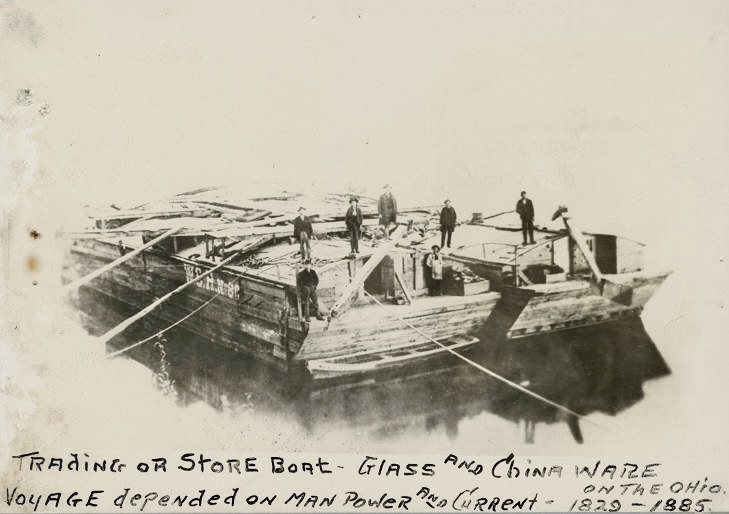 Floating merchant shops brought items such as china and  glassware (as the one in this photograph), tools, and furniture and services such as photography to communities along the river that were not able to support  merchants like these on their own. The photograph states that the “voyage depended on manpower and current” but some store flatboats were towed upstream by steamboats.