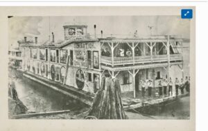 Augustus B French operated a series of showboats, including this New Sensations version. These floating theaters were moved by steamboats up and down the Ohio River and other waterways. Notice that the photograph shows no smokestacks on the showboat, but there is a steamboat right behind it. They would stop for one night stands wherever there might be a viable audience. They could seat up to 1400 people at a performance and brought music, drama, and vaudeville to riverside communities that might have limited opportunities for entertainment otherwise. In this photograph, we see a band playing on the deck to attract attention. Get tickets while you can!