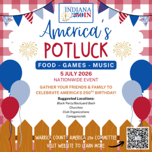 The Warrick County America 250 Committee invites YOU to participate in a NATIONWIDE event! Gather your friends and family to your local church, a campground, club organization, or even backyard and neighborhood to celebrate America’s 250th birthday!